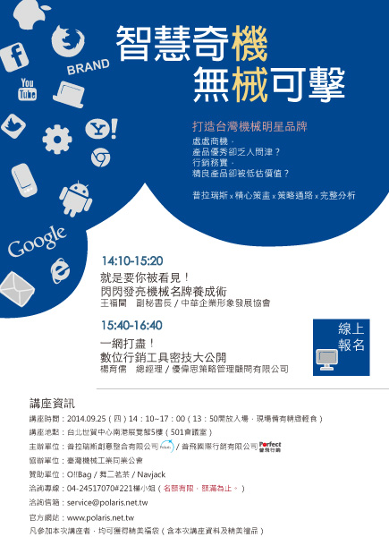 普拉瑞斯创意与普飞国际行销公司,特别针对机械产业困境,配合本次台北国际塑橡胶工业展览会,于九月二十五日下午两点到五点,假台北世贸中心南港展览馆 501 会议室,联手举办 『智慧奇机 无械可击—打造台湾机械明星品牌』座谈会。欢迎塑橡胶机械产业以及有兴趣人士报名参加,限额 45 席,额满为止!不另行收取费用,参加者可获奖座资料与精美礼品。