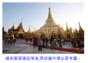 缅甸历经许多政治上的转变与动荡,直到 2010 年才进入民主时代,2012 年 11 月公布新外人投资法,吸引外资进入,但因为基础设施落后不足、缺供应链、土地价格租金飙涨等因素,所以对许多外资而言,初期都采观望态度,主要贸易伙伴集中亚洲国家。随着外人投资法以及欧美经济制裁放宽,外资才开始较多前往缅甸投资于制造业。国际知名大厂可口可乐及三星已经宣布在缅甸设厂。然而外人投资缅甸仍受限于相关基础建设落后,物流运输成本高、土地价格租金飙涨、缅甸投资主管机关行政裁量权过大且不透明以及金融体系落后仍需现金交易等限制。
